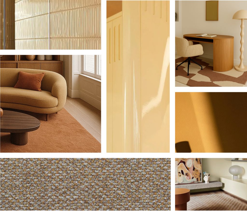 Marigold captures the warm glow of the golden hour. Butter yellow, retro mustard and mellow golden tones bring optimism and softness. Marigold adds a retro nod without feeling loud or overpowering. Think boucle textures, soft chenille fabrics, warm woods and dry, powdery finishes. A palette designed to add optimism, warmth and depth.