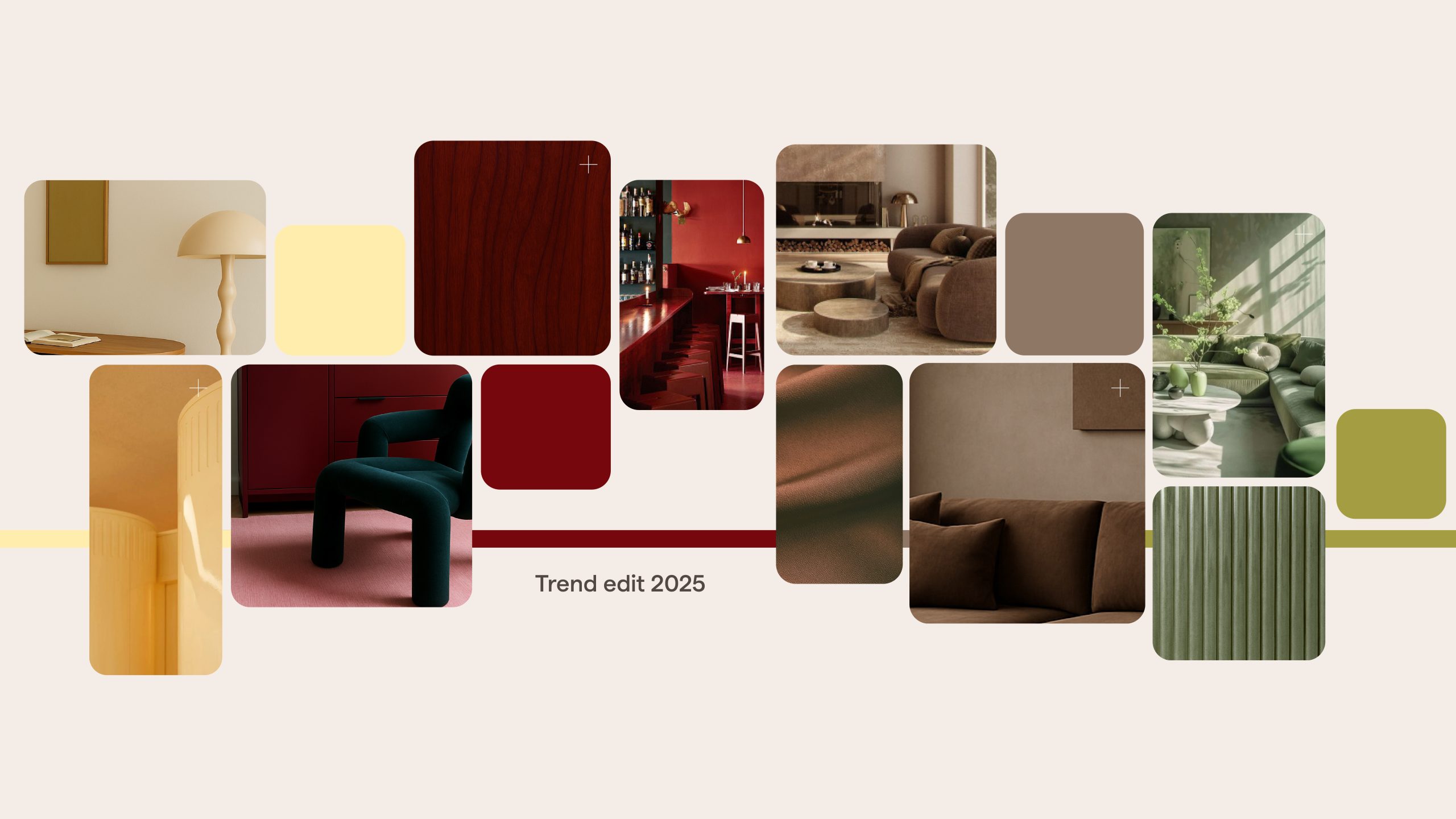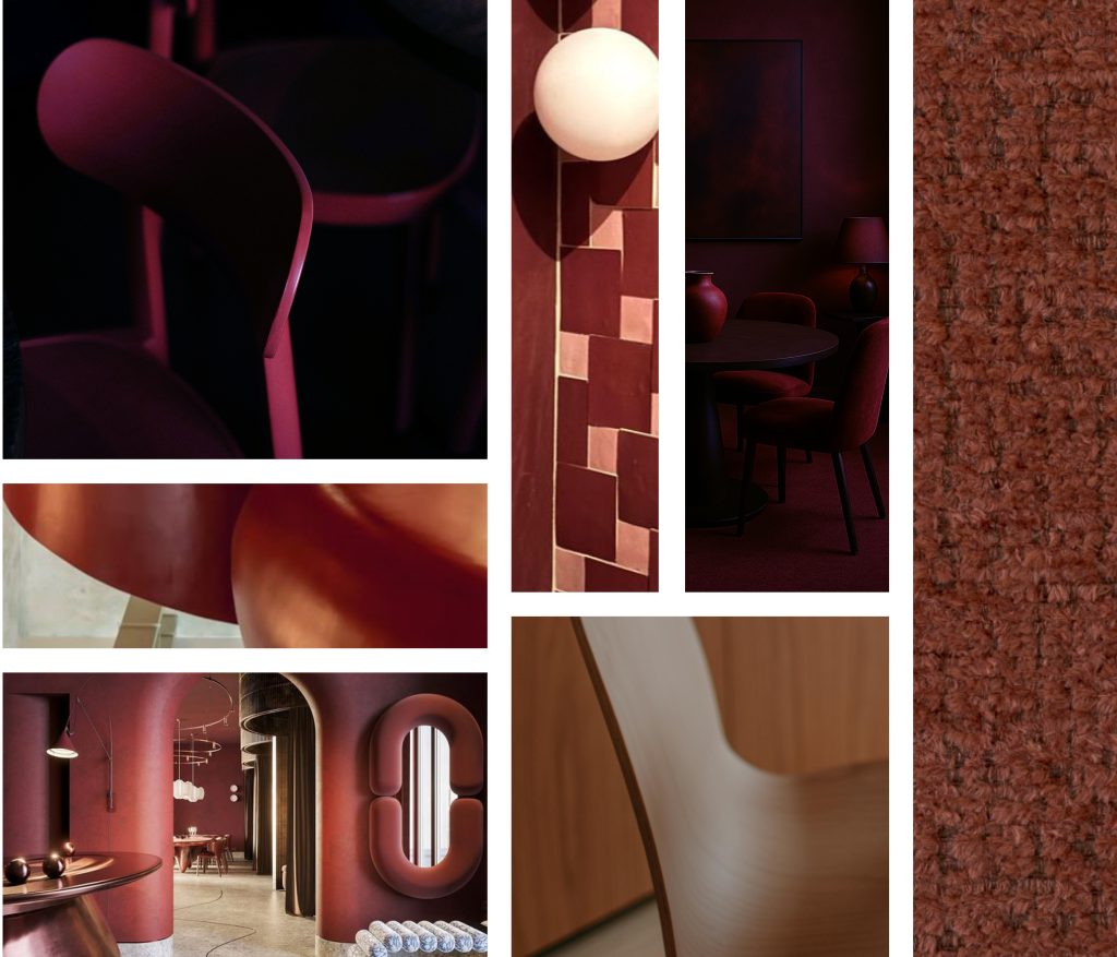 Hazel Bloom blends warm red tones, dusty rose, earthy hazel and a touch of burgundy in a palette that feels grounded and elegant. Inspired by earthy pigments, sun-warmed surfaces and worn leather, these colours create warmth without shouting. Think tactile fabrics, soft upholstery, burgundy marble, clay-coloured ceramics and natural hues. A versatile palette for warm and timeless interiors